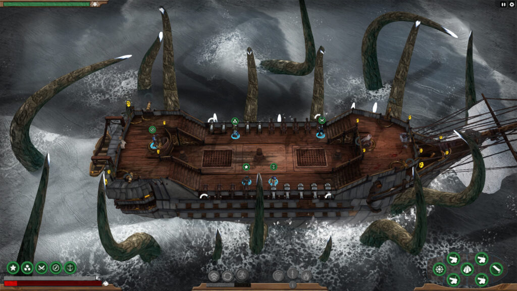 Die Soundeffekte sind auch richtig solide. Vom Knarzen des Schiffs, dem Krachen der Kanonen oder auch dem Heulen des Windes und dem Peitschen der raue See, all das trägt mächtig zur Immersion bei – und ihr wisst, wie sehr ich so eine Atmosphäre liebe! Und wenn dann noch wilde Tentakel aus den Tiefen emporsteigen und die Crew in heller Panik herumschreit und wild durcheinander rennt, weiß man, dass man schon mal vorsichtshalber das Rettungsboot bereitlegen sollte…