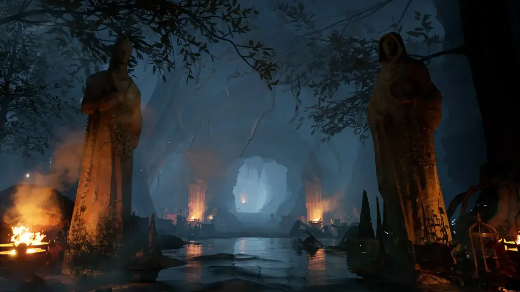 Nightingale beeindruckt sofort mit seiner atemberaubenden Grafik. Dank Unreal Engine 5 erstrahlen die verschiedenen Biome in lebendigen Farben und Details und dichte Wälder oder neblige Sümpfe strotzen nur so von Atmosphäre. Hinzu kommen die ganzen aufwendigen Assets, wie zum Beispiel die wunderschönen riesigen Steinfiguren, in Felsen gebaute Behausungen und die interessanten Dungeon, die mit ihren ganz eigenen spektakulären Momenten glänzen. Die Lichtstimmungen und Texturen schaffen hier eine unglaublich immersive Welt, die ständig zum Erkunden einlädt und erobert werden will.